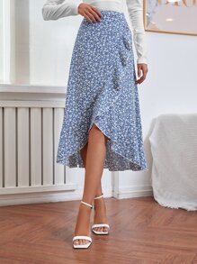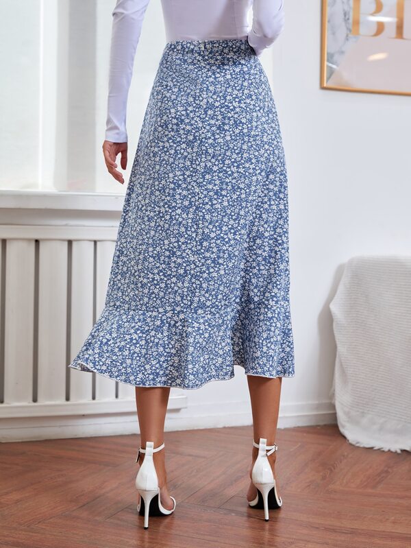 SHEIN Privé Ditsy Floral Print Lettuce Trim Ruffle Hem Skirt
