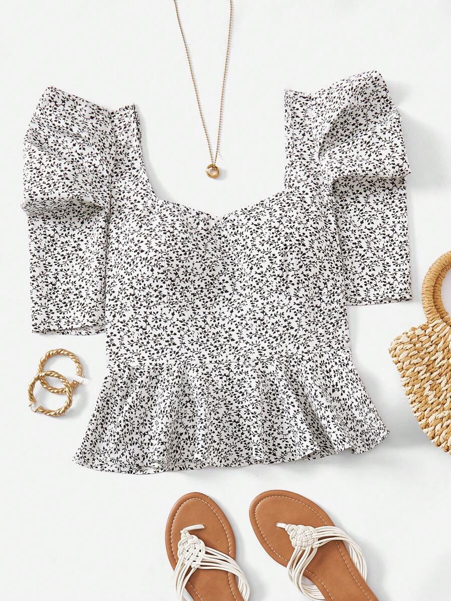 SHEIN VCAY Ditsy Floral Print Sweetheart Neck Puff Sleeve Peplum Top