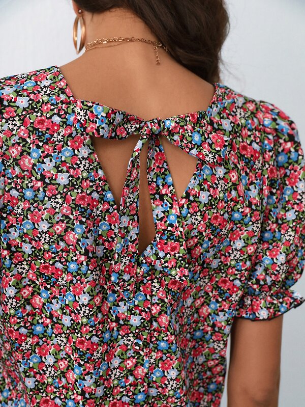 SHEIN Frenchy Ditsy Floral Print Tie Back Puff Sleeve Blouse