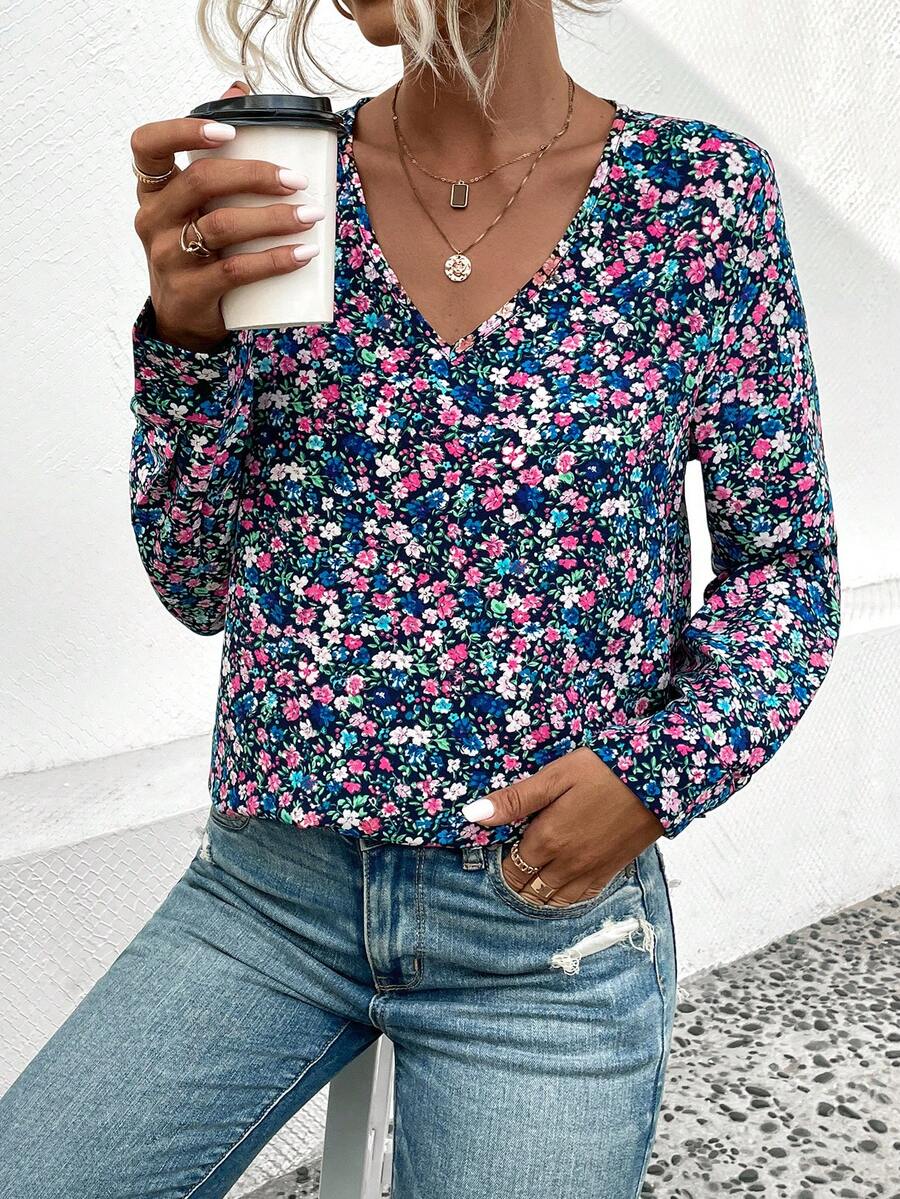 SHEIN LUNE Ditsy Floral Print V Neck Blouse