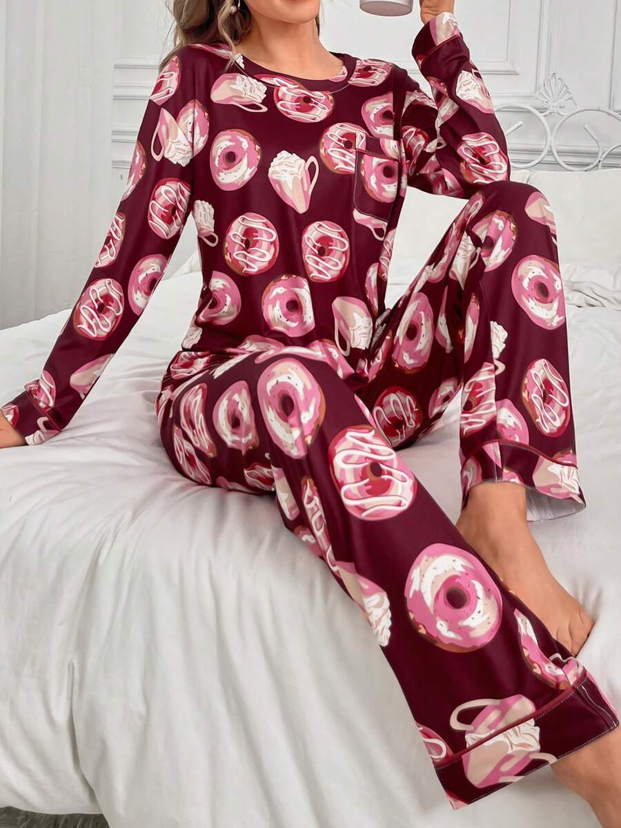 Donut Print Round Neck Long Sleeve Pajama Set
