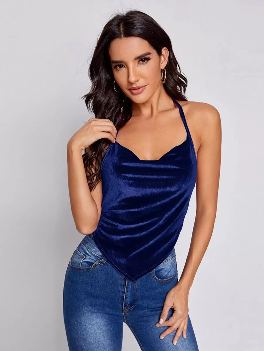 SHEIN BAE Draped Neck Hanky Hem Tied Back Velvet Halter Top