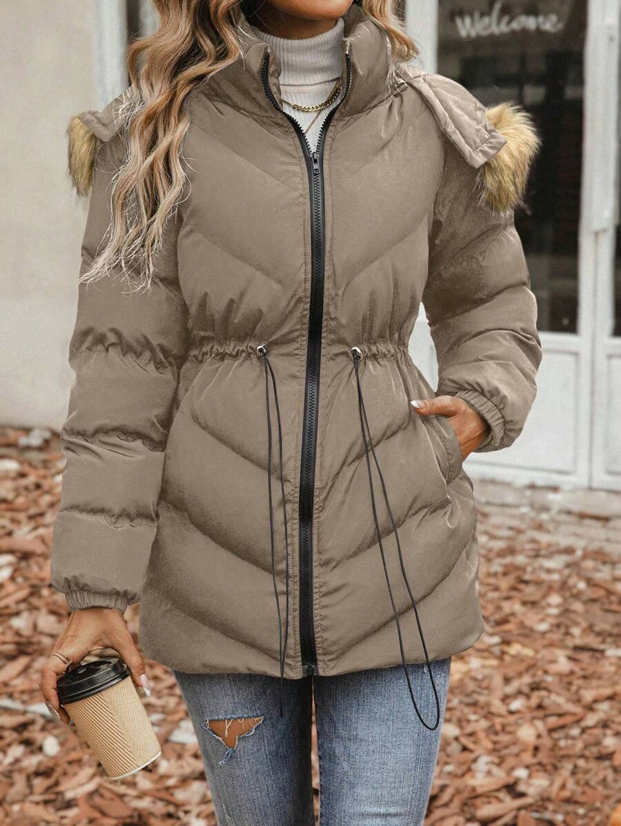 SHEIN Essnce Drawstring Patchwork Hooded Padded Jacket With Frayed Hem