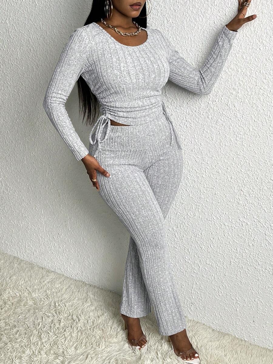 SHEIN Slayr Casual Round Neck Long Sleeve Crop Top With Drawstring Band On Both Sides And Straight Leggings Women's Two-Piece Outfit In Gray Fleecy Textured Stripe