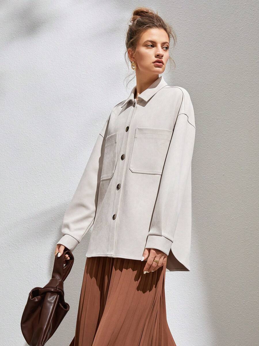 Anewsta Drop Shoulder Pocket Patched Button Front Suedette Shirt