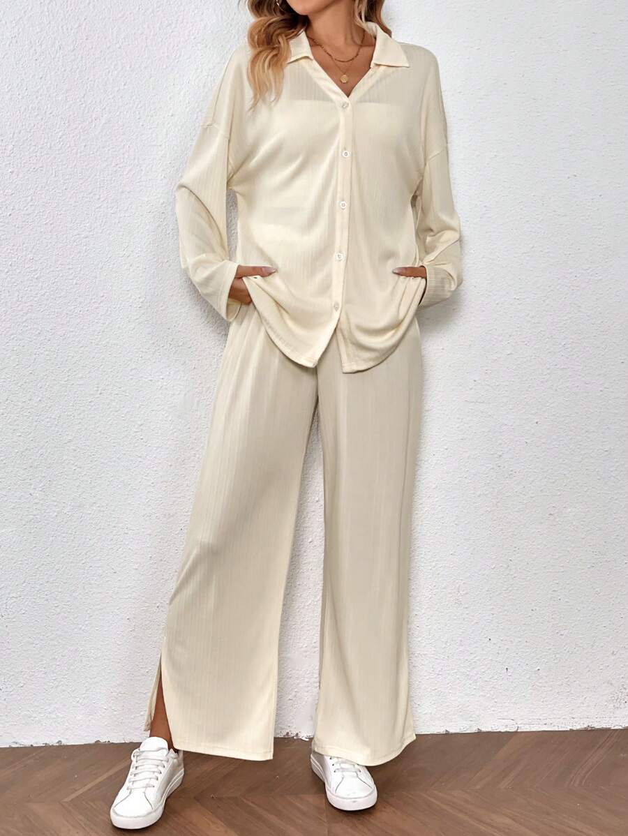 SHEIN Essnce Drop Shoulder Shirt & Split Hem Wide Leg Pants