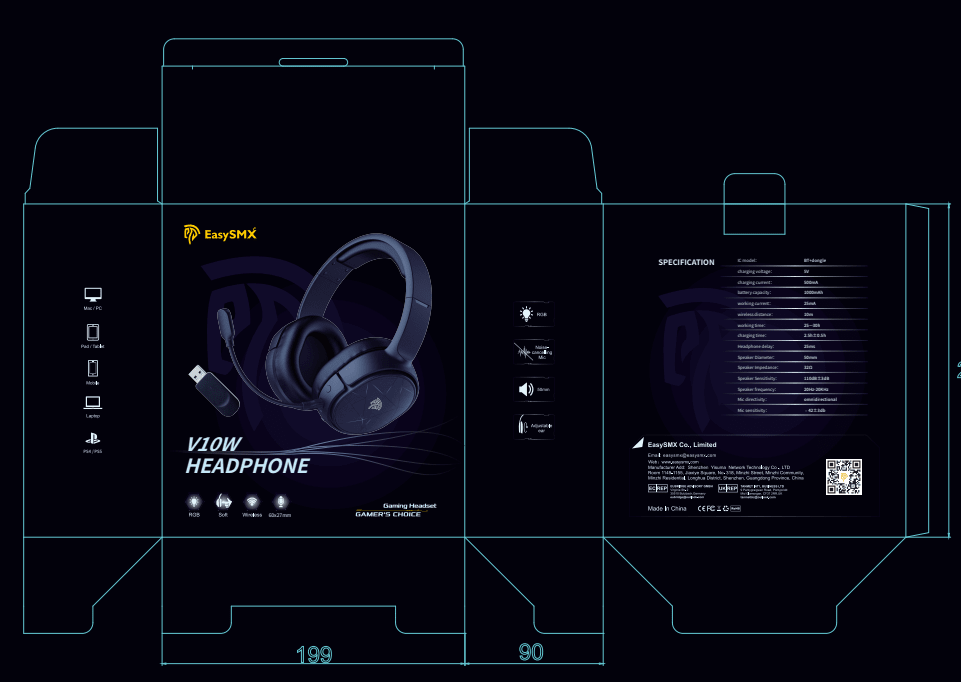 EasySMX V10W Wireless Headphones 2.4GHz/BT PC Gaming Headset For PS4/PS5/NS/Steam Deck/Smartphone, With Detachable Microphone, Black