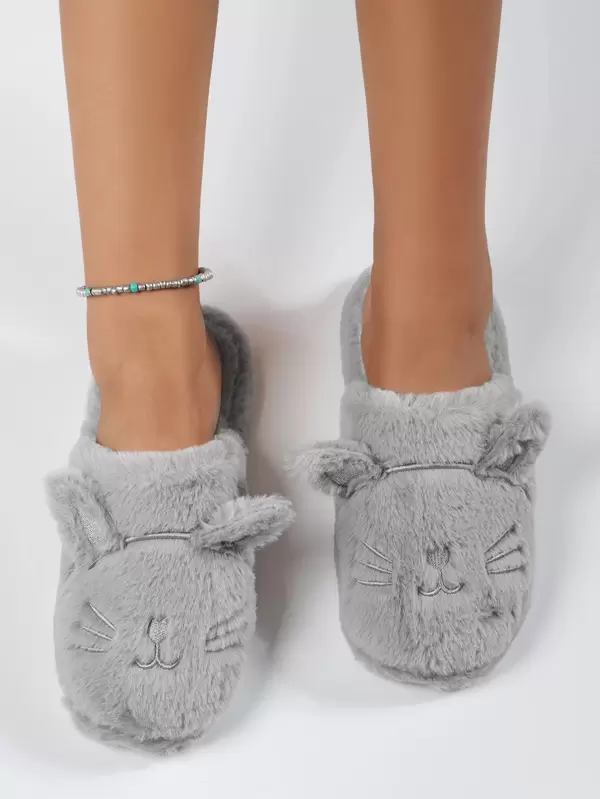 Embroidered Detail Cat Design Fuzzy Novelty Slippers