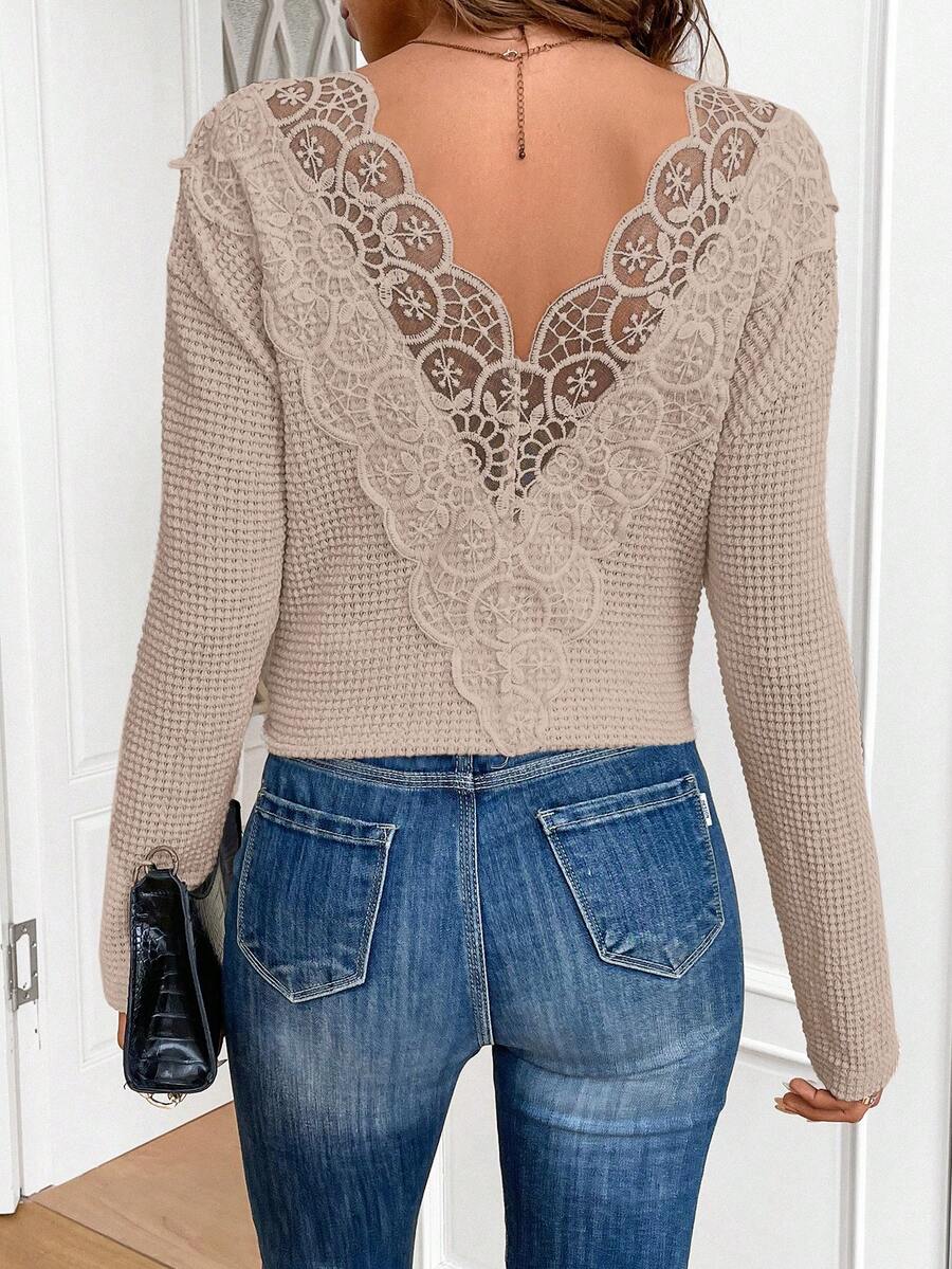 SHEIN Frenchy Embroidered Patchwork V-Back Design Long Sleeve T-Shirt