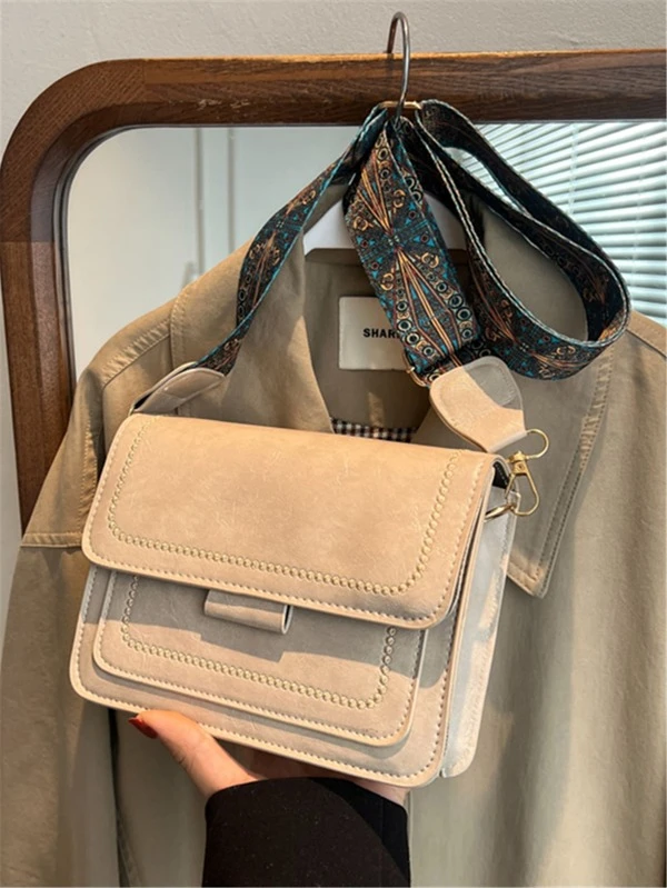 Embroidery Detail Flap Square Bag Vintage Mini Crossbody Bag Geometric Strap Shoulder Bag Women's Faux Leather Flap Purse