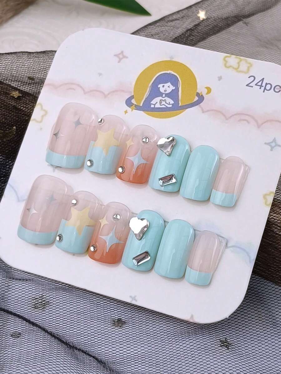 Enhance Your Look Y2K 24Pcs Handmade 3D Painting Heart Super Glossy Press On Nails Short Pink French Style Gradient Star Pattern Cute Fashion Fake Nails With Rhinestone Shine Reusable False Nails For Women