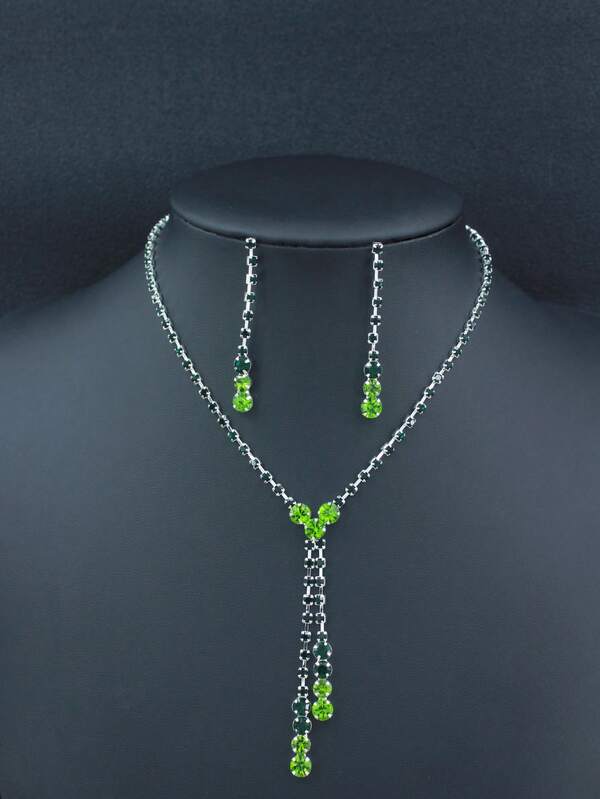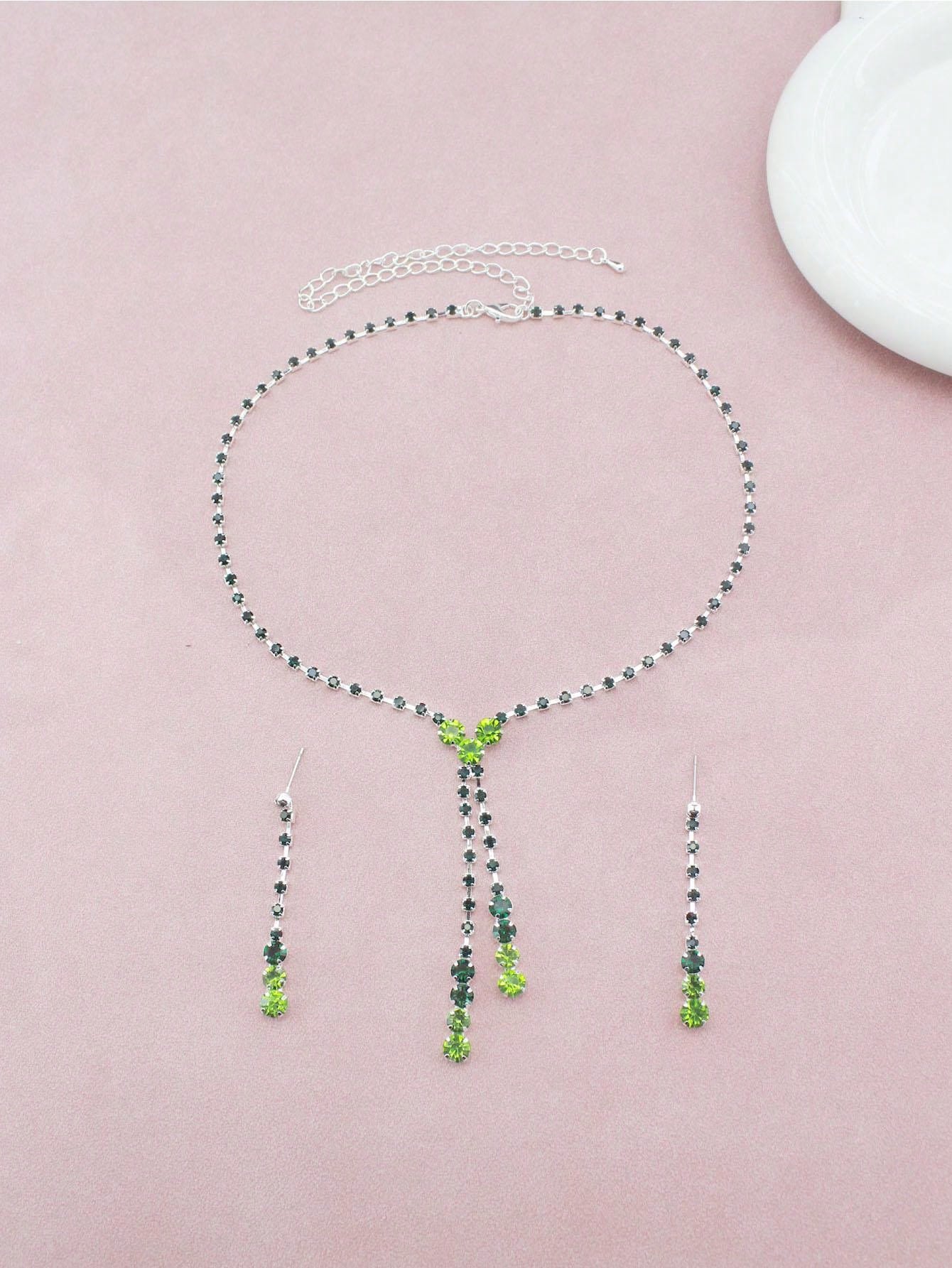 European And American Fashionable Simple Single-Layer Green Rhinestone Gradient Exquisite Necklace Earrings Set For Women, Elegant Jewellery For Parties And Banquets