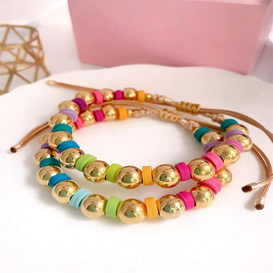 European And American Style Copper Plated Gold Beaded Bracelet, Bohemian Style Hand-woven Rainbow Soft Pottery Bracelet For Women