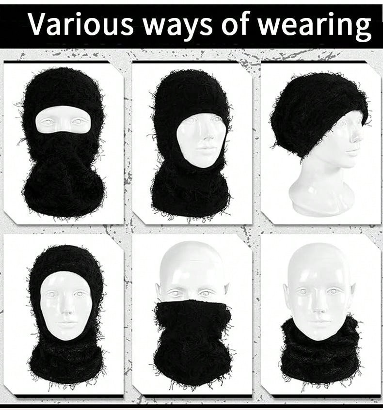 European And American Style Knitted Warm Face Mask And Hat Combination With Camo Jacquard Design And Fluffy Top, One Hole