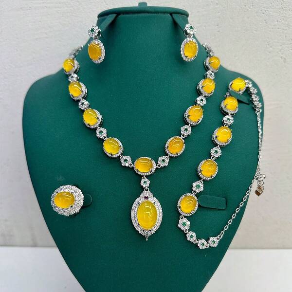 European And American Style White Zirconia Four-Piece Jewelry Set, Dubai Bridal Wedding Arab Evening Dress Yellow Necklace Earrings Rings And Bracelet Set