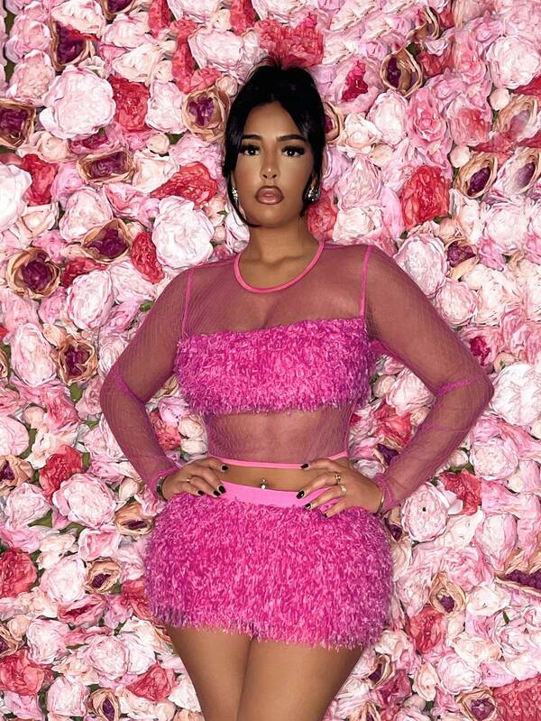 SHEIN SXY Evening Dress Sexy Mesh & Feather See-Through Long Sleeve Top And Skirt Set For Formal Party