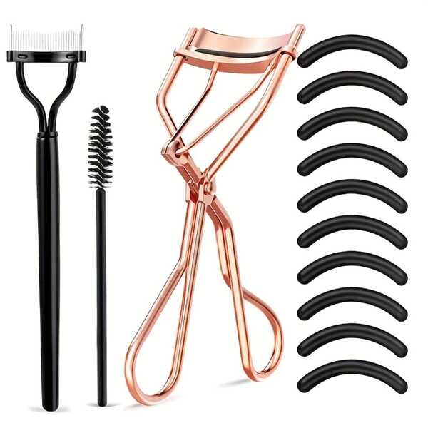 Eyelash Curler & Brush Set: 1pc Stainless Steel Curler, 1pc Eyelash Comb, 1pc Eyelash Brush, 10pcs Silicone Pads, With Carbon Steel Lash Curler & False Eyelash Helper Tool, Eye Beauty Makeup Accessory