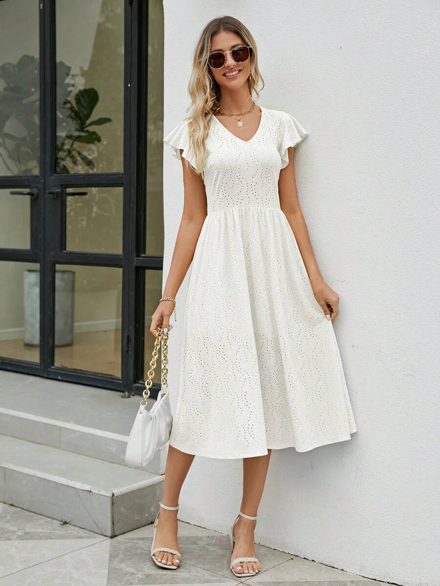 Eyelet Embroidery Butterfly Sleeve A-line Dress