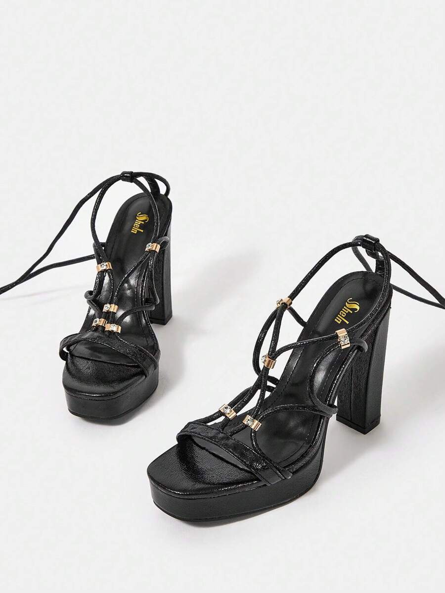 SHEIN SXY Fashionable & Comfortable Women's Black Strappy High Heel Sandals With Rhinestone Decor
