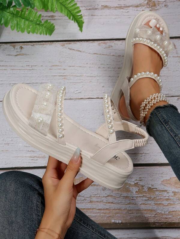 Fashionable Ladies' Thick-soled Sandals With Artificial Pearls Embellishment