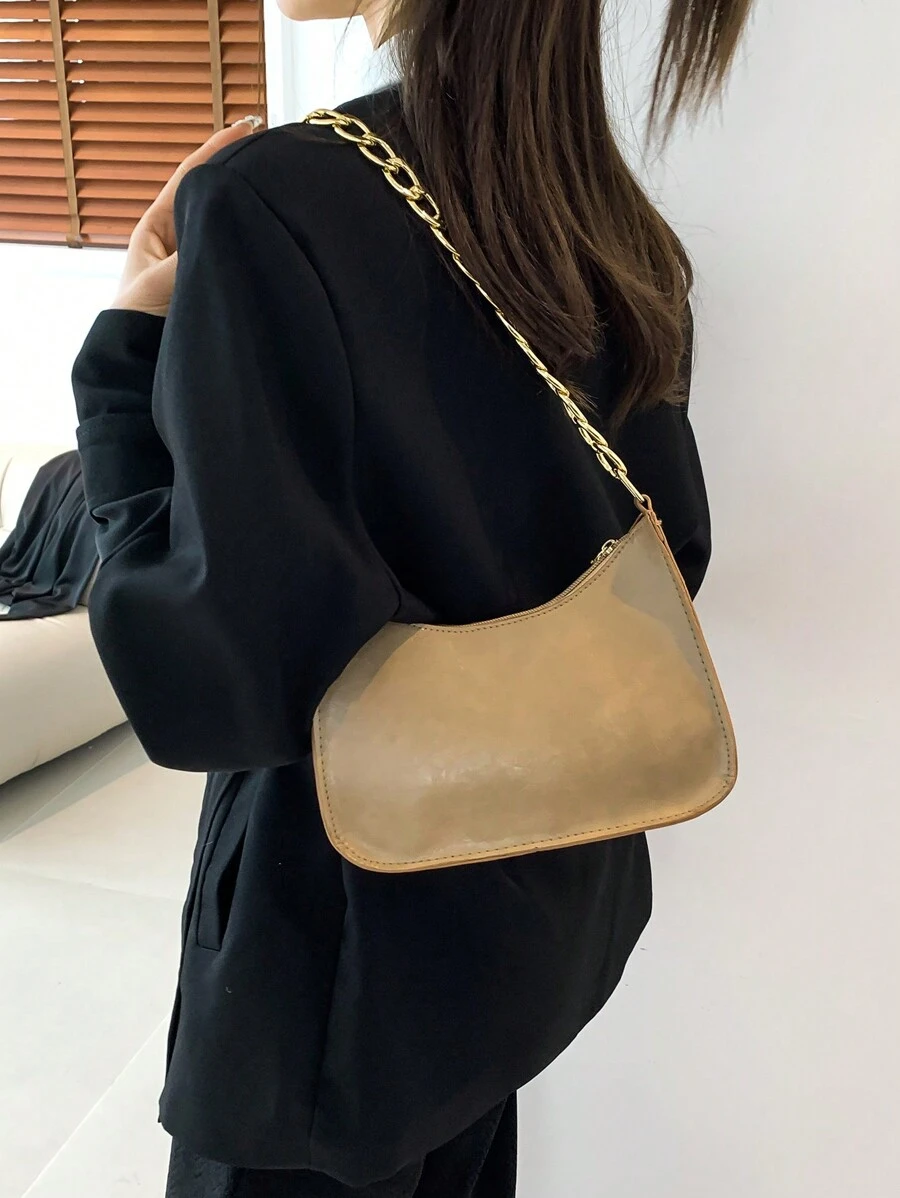 Fashionable Metal Chain Shoulder Strap Retro Single-Shoulder Baguette Bag Women'S Bag Solid Color Oil Skin Multi-Purpose Armpit Crescent Bag Handbag