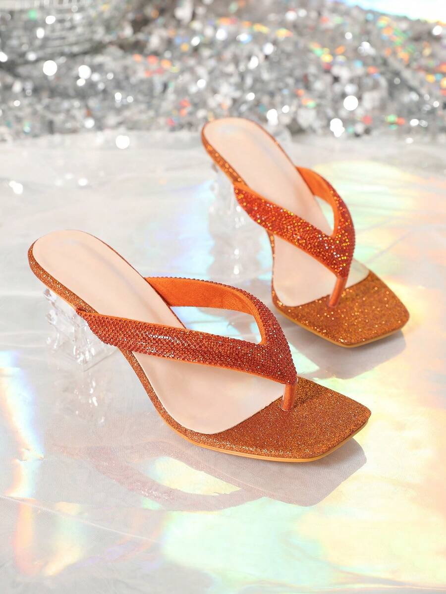 Fashionable Rhinestone Slip-On Square Toe Clear High Heels Sandals