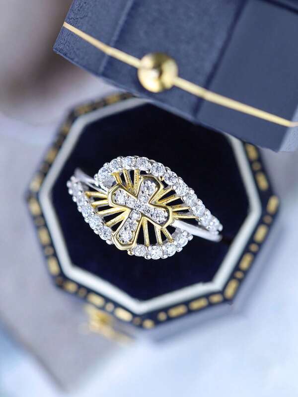 Fashionable Two Tones S925 Sterling Silver Ring Studded With Rhinestone, Cross Shaped Women's Engagement/wedding Ring