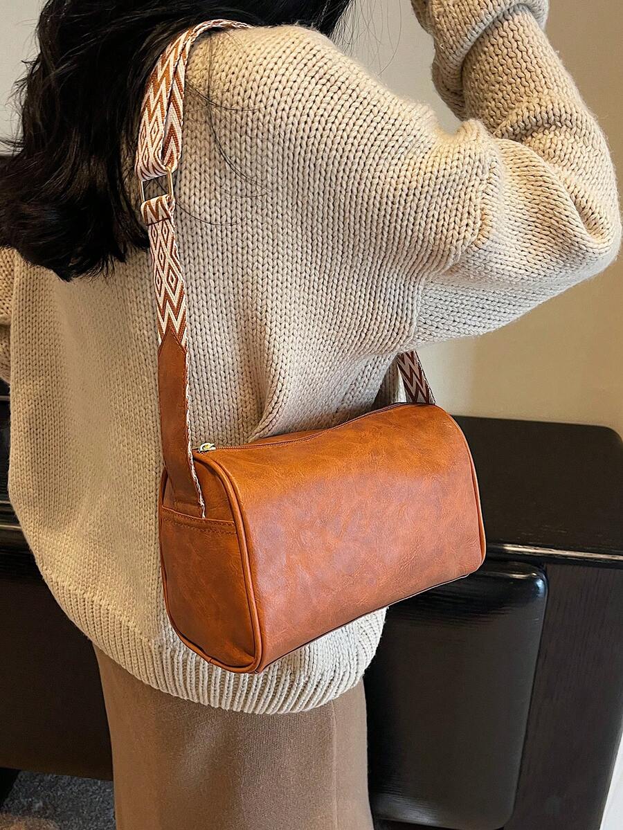 Fashionable Vintage Solid Color Multi-Use Printed Weave Strap Shoulder Crossbody Bag With Multiple Pockets For Women