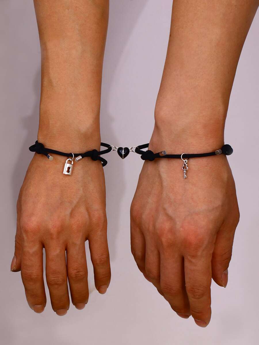 Fashionable and Popular Men's 2pcs Couple Magnetic Heart & Lock Charm Bracelet for Jewelry Gift and for a Stylish Look