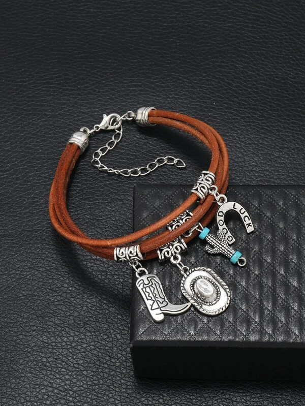Fashionable and Popular Men Boots & Cactus Charm Layered Bracelet PU for Vacation and for a Stylish Look