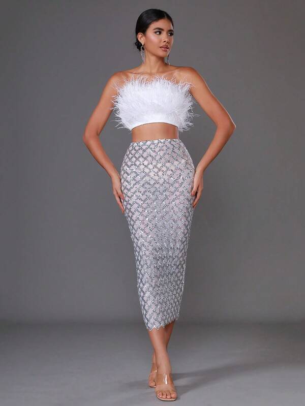 Modphy Faux Feather Sexy Women's Strapless Beaded Bodycon Dress Two Piece Set