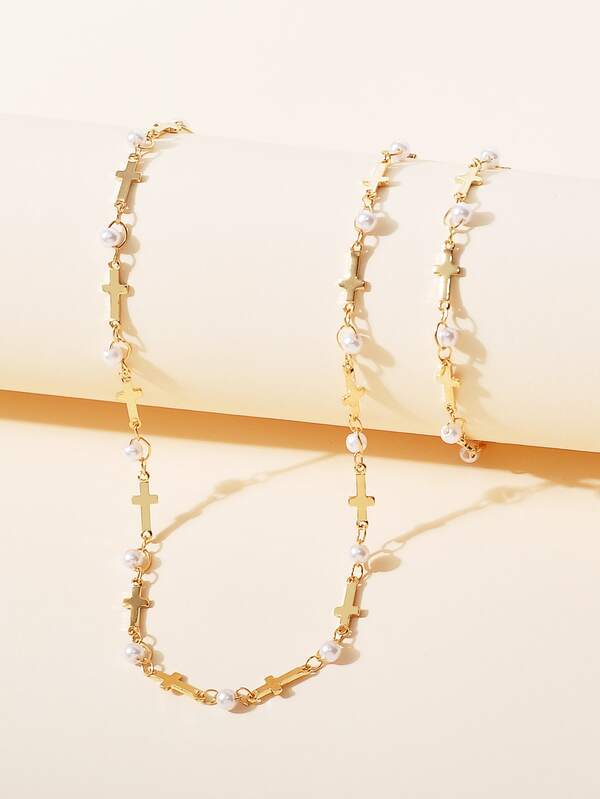 Faux Pearl & Cross Decor Necklace & Bracelet