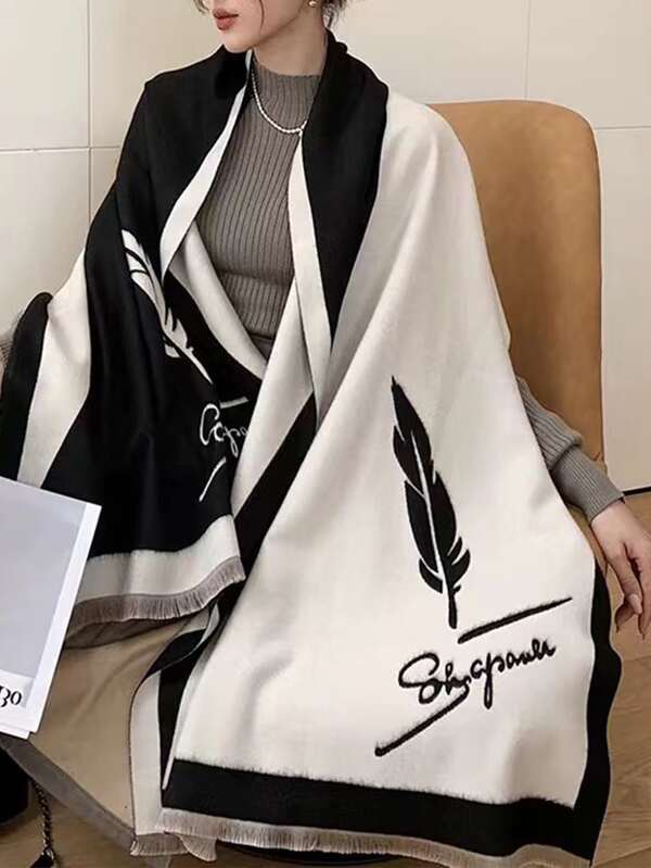 Feather & Letter Graphic Raw Trim Scarf
