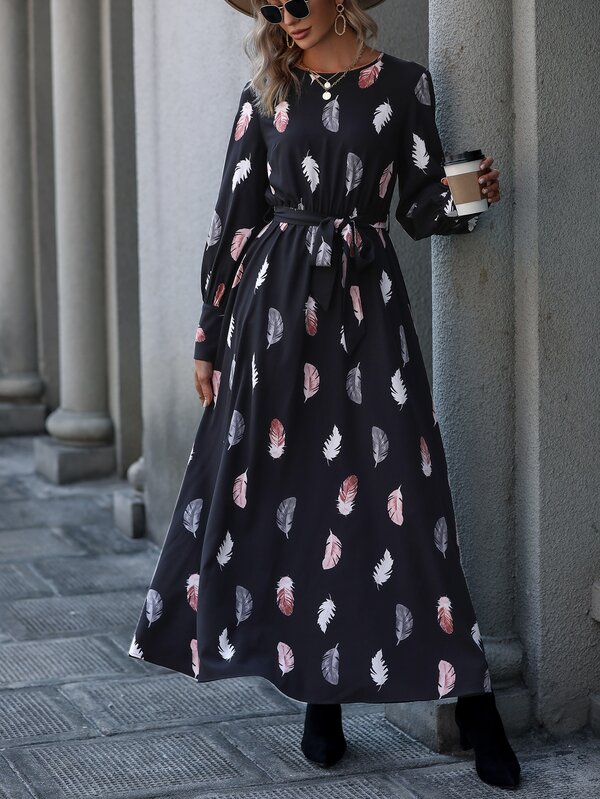 SHEIN LUNE Feather Print Lantern Sleeve Belted Dress