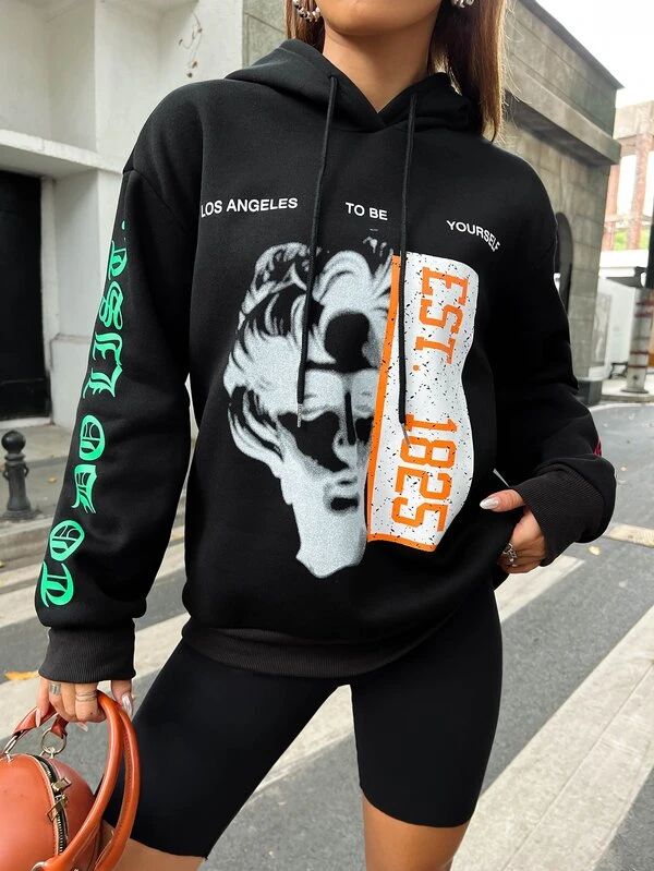 Figure & Slogan Graphic Drop Shoulder Drawstring Hoodie