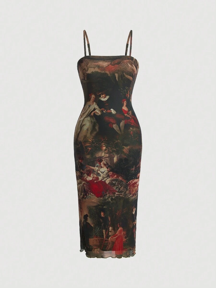 SHEIN MOD Figure Graphic Lettuce Trim Mesh Cami Dress