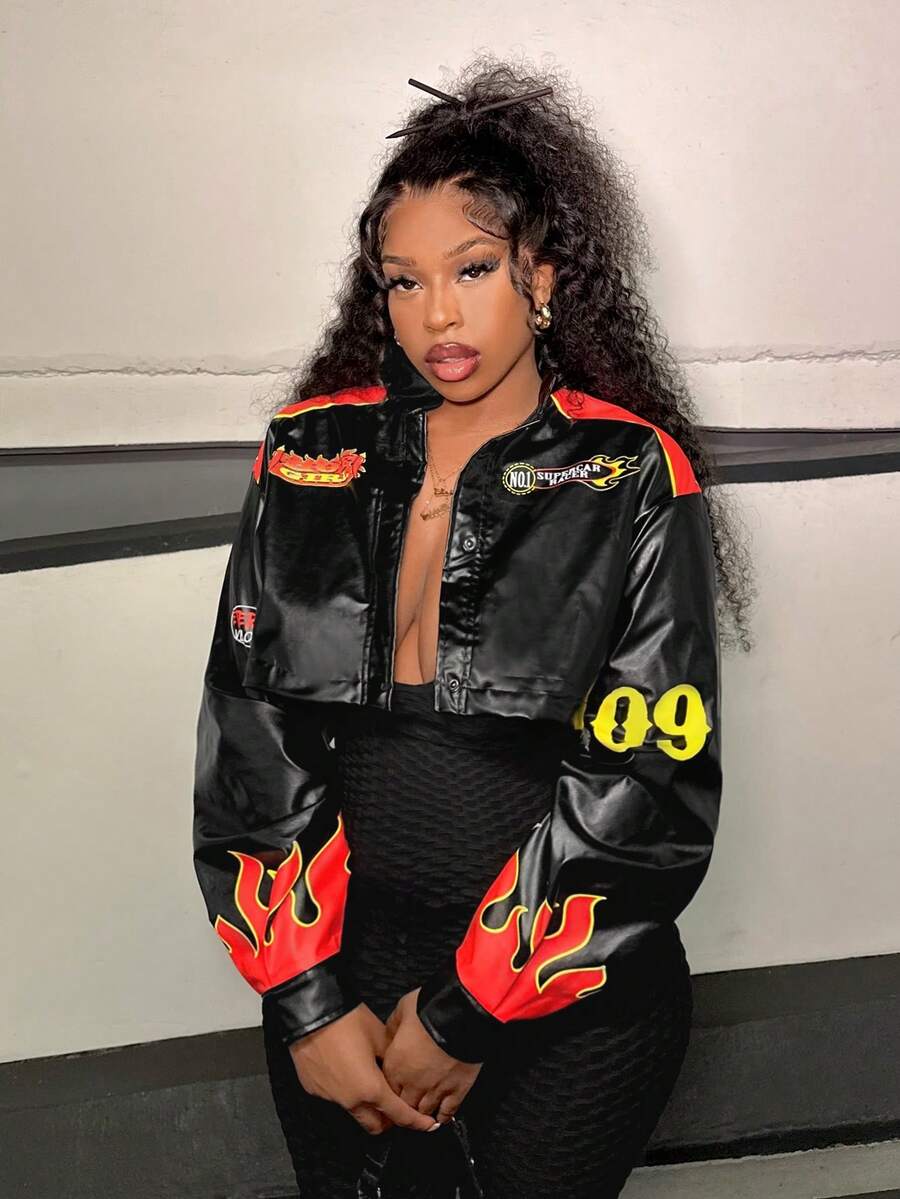 SHEIN Slayr Street Style Red Flame Pattern Black Pu Fabric Cropped Women's Biker Jacket
