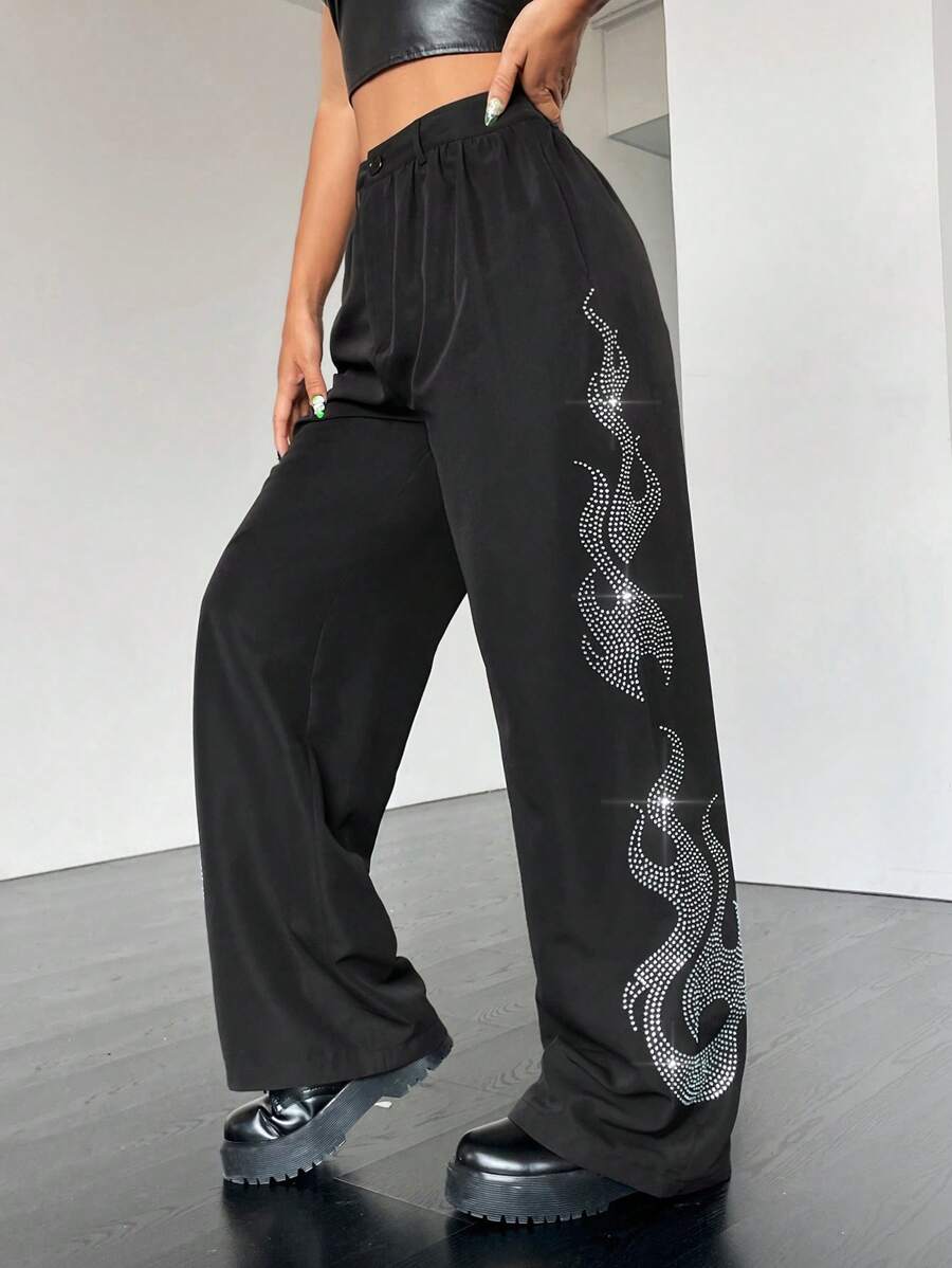SHEIN Coolane Flame Pattern Rhinestone Embellished Long Pants