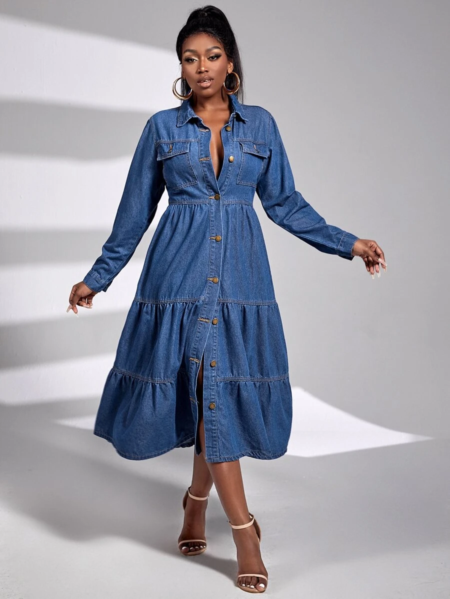 SHEIN SXY Flap Detail Ruffle Hem Denim Dress