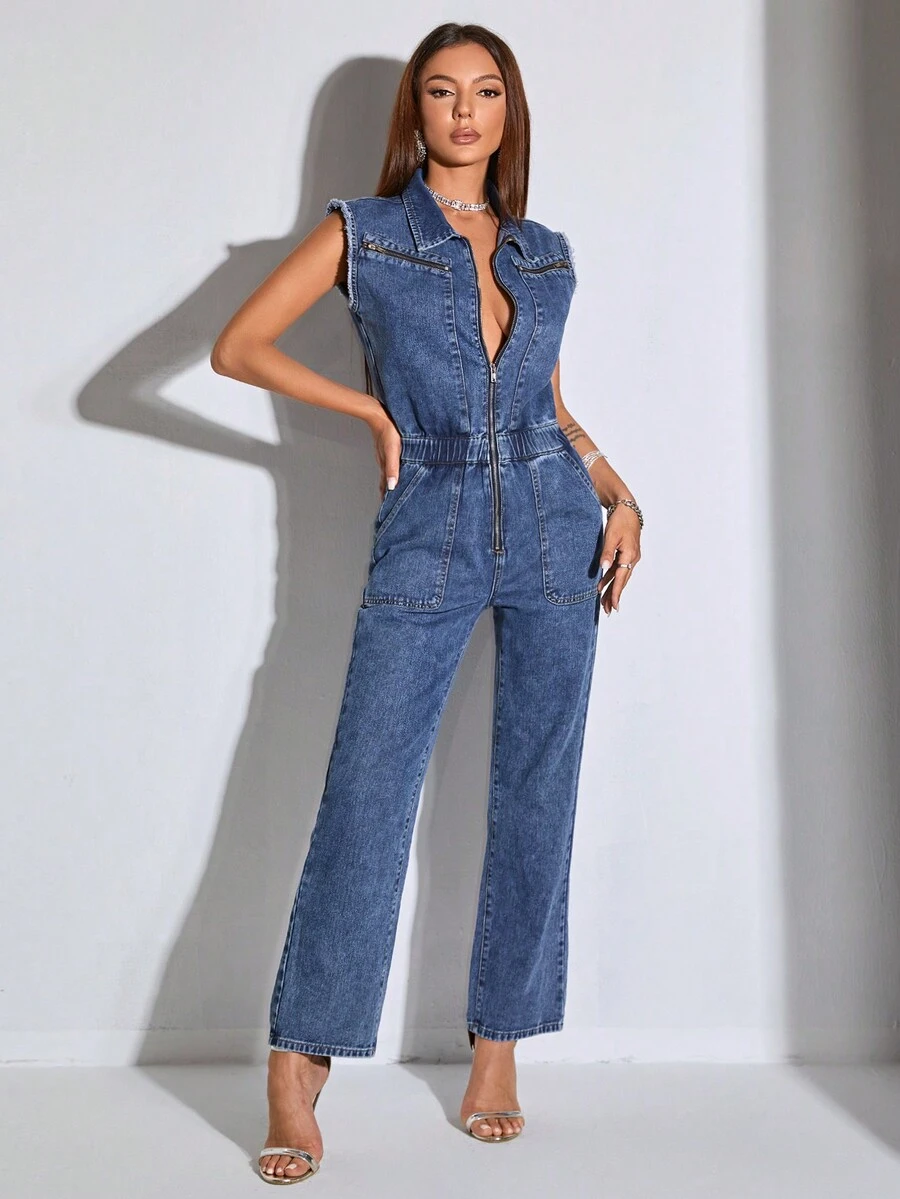 SHEIN BAE Flap Pocket Zip Up Denim Jumpsuit