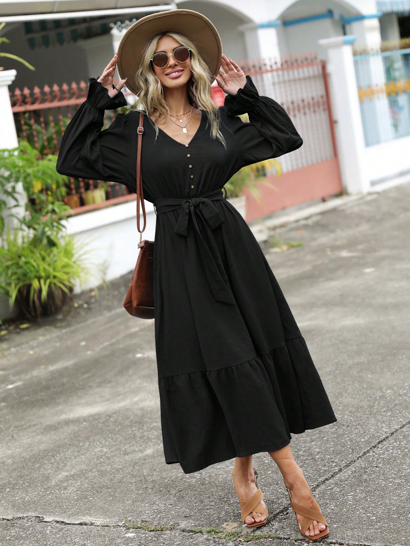 SHEIN LUNE Flare Sleeve Ruffle Hem Belted Dress