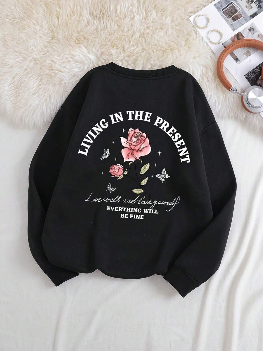 Floral & Slogan Graphic Thermal Lined Sweatshirt