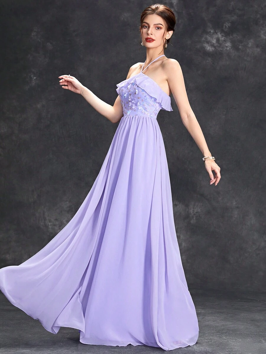 SHEIN Unity Floral Applique Contrast Sequins Ruffle Trim Backless Halter Neck Chiffon Formal Dress