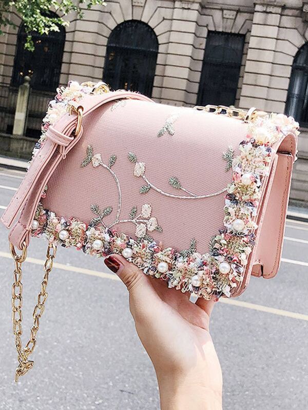 Floral Embroidered Faux Pearl Decor Flap Square Bag