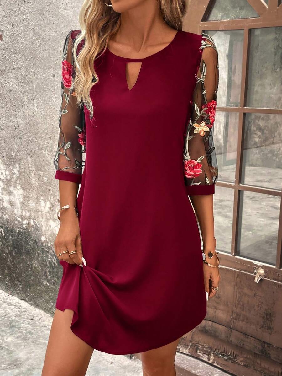 SHEIN Clasi Floral Embroidery Mesh Sleeve Keyhole Neckline Dress