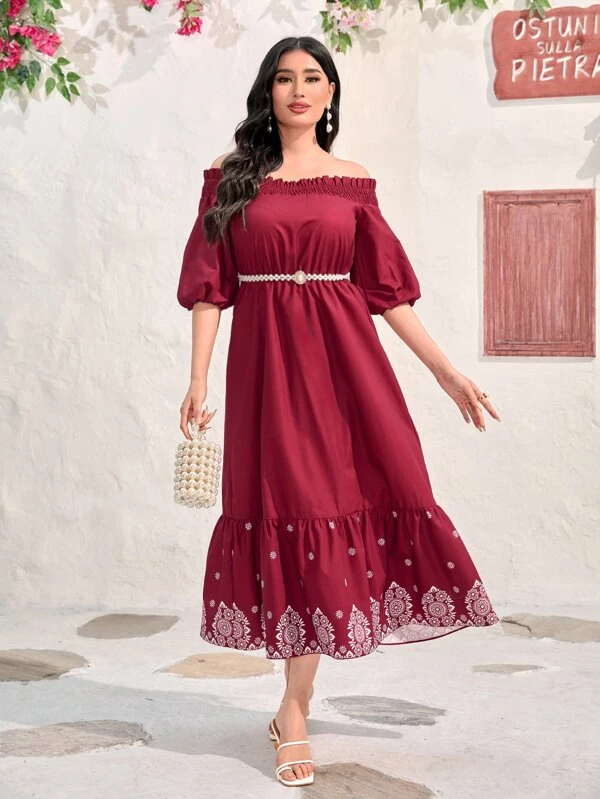 SHEIN Modely Floral Embroidery Off Shoulder Ruffle Hem Dress Without Belt