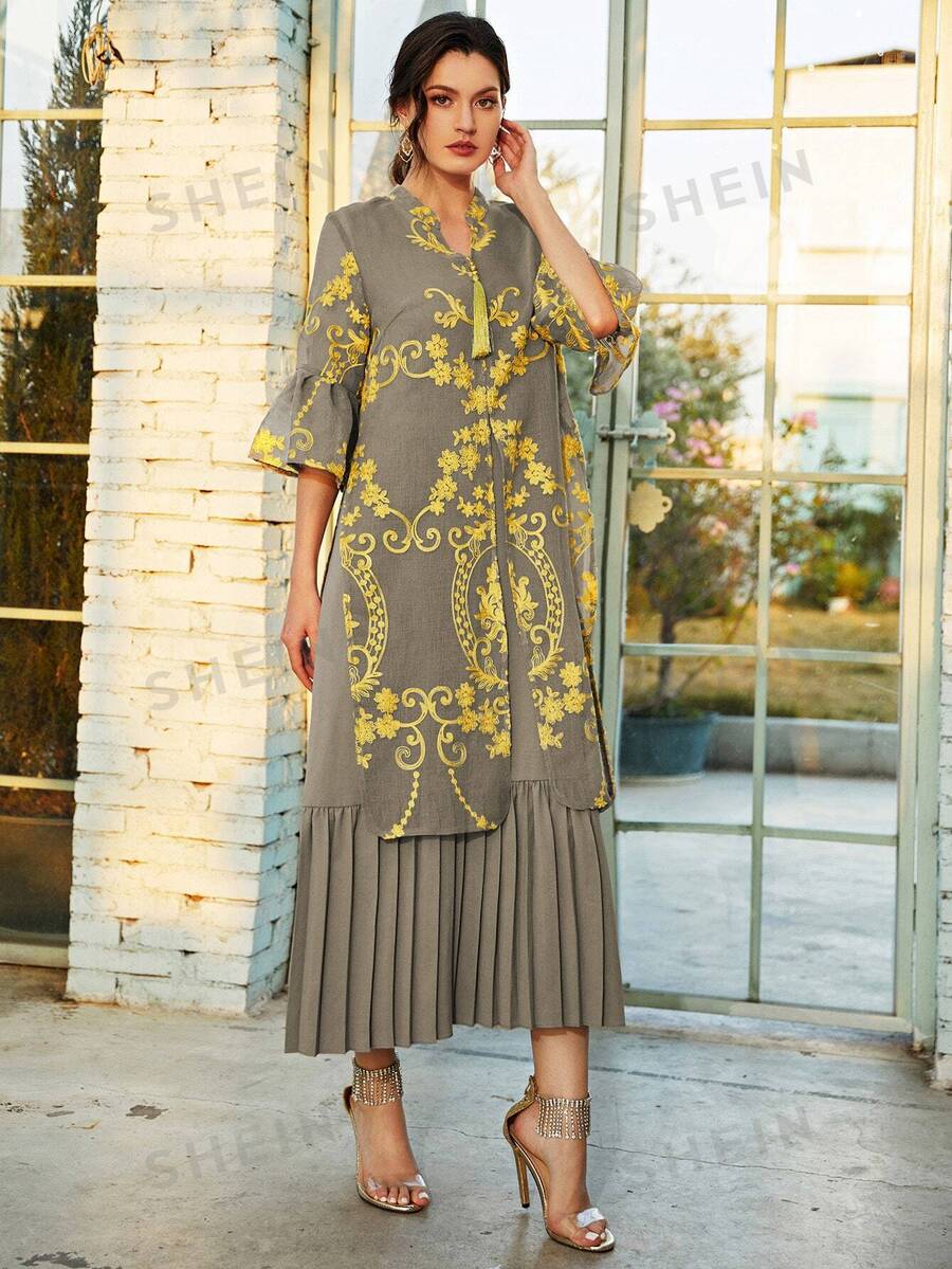 SHEIN Najma Floral Embroidery Split Tunic With Pleated Hem Dress