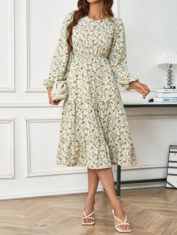 SHEIN LUNE Floral Lantern Sleeve Dress With Ruffle Hem For Women