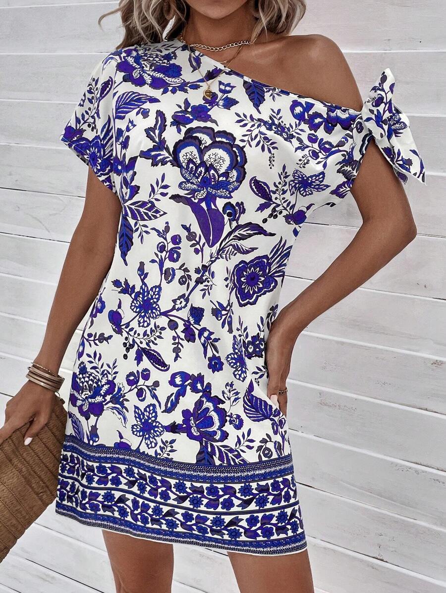 SHEIN LUNE Floral Print Asymmetrical Neck Knot Side Dress