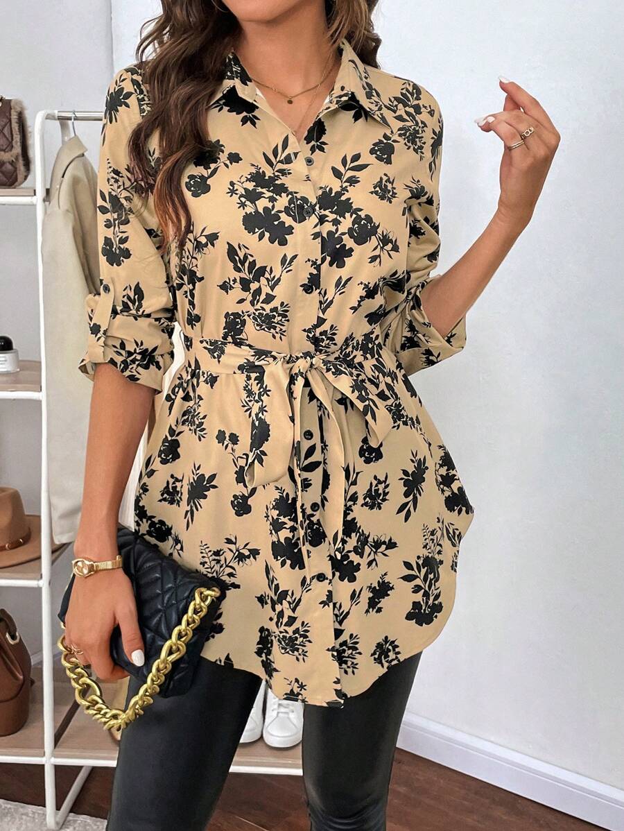 SHEIN Clasi Floral Print Belted Shirt